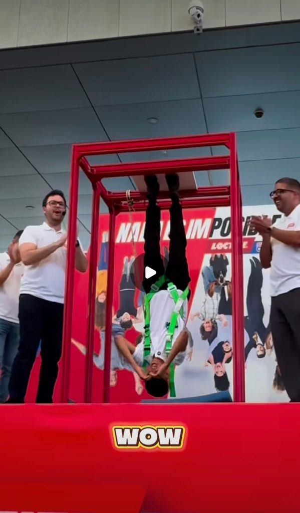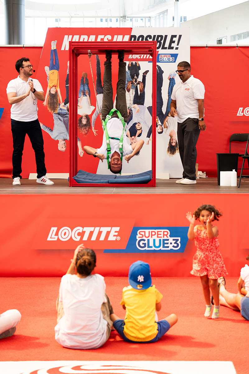 El punto culminante del evento fue la impactante demostración «Hanging Man». El influencer Raúl Peña (@raulmagic_) fue suspendido boca abajo, sostenido exclusivamente por Loctite Super Glue-3. Esta increíble hazaña no solo dejó a los asistentes asombrados, sino que certificó de manera visual la fuerza, rapidez y resistencia inigualable de nuestro producto. Fue una prueba irrefutable de que, con Loctite, lo difícil se vuelve posible.